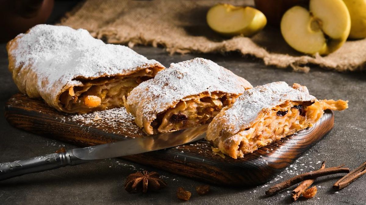Apel strudel Merupakan kue pastry berlapis yang diisi dengan apel segar dan berbagai varian rasa modern.